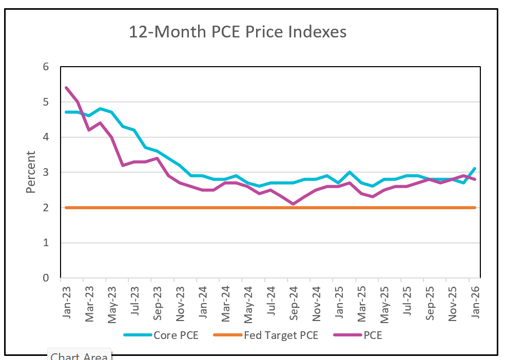 Inflation dynamics remain a central concern for policymakers. The core PCE price index rose 3.1% over the past year, remaining well above the Federal Reserve’s 2% target and continuing an upward trend since mid-2025. Notably, the PCE measure has recently outpaced the more widely followed CPI, partly because slowing rent increases have a smaller impact on PCE. Additionally, rising goods prices since November suggest that tariffs may be contributing to upward price pressures.