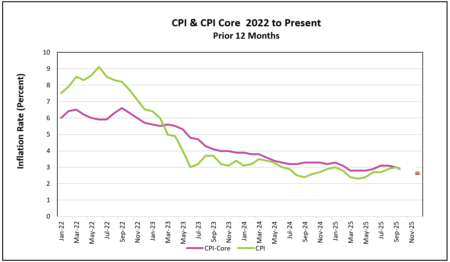 In summary, inflation has fallen substantially from its 9.1% peak four years ago, but progress has slowed in recent years. A year ago, the 12-month CPI stood at 2.9% and core inflation at 3.2%, highlighting how stubborn price pressures have been. The Bureau of Economic Analysis will release the Fed’s preferred inflation gauges—the PCE price indexes for November—on January 22, and Higher Rock will summarize and review the data shortly after publication.