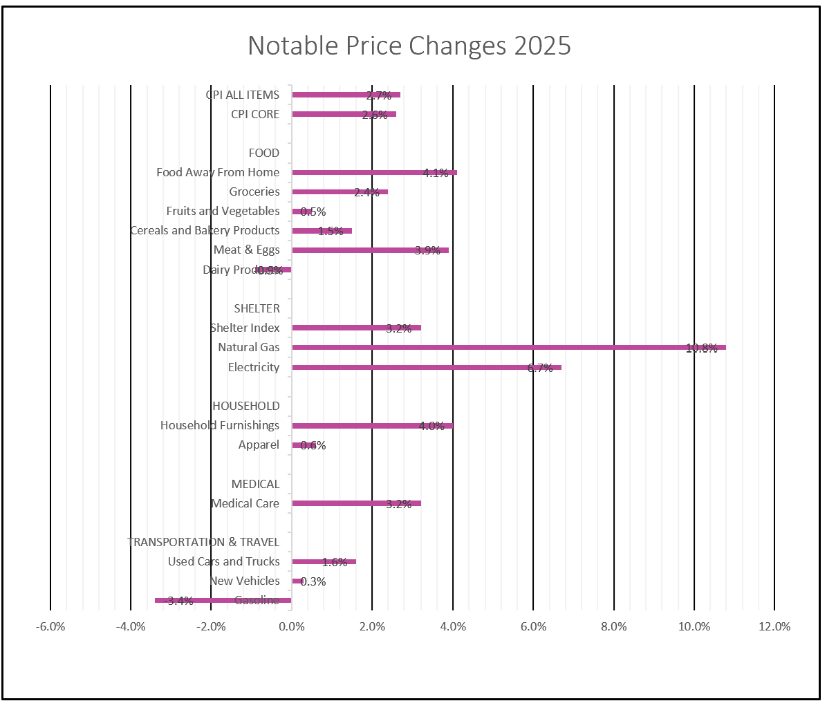 Energy prices provided some offset to broader inflation pressures. Gasoline prices declined 0.5% in December, down 3.4% from a year earlier, shaving roughly one-tenth of a percentage point off the 12-month CPI and helping to restrain headline inflation for much of the year. Within the broader energy category, however, price movements diverged sharply: while gasoline prices fell, electricity costs climbed 6.7% and natural gas prices surged 10.8%.