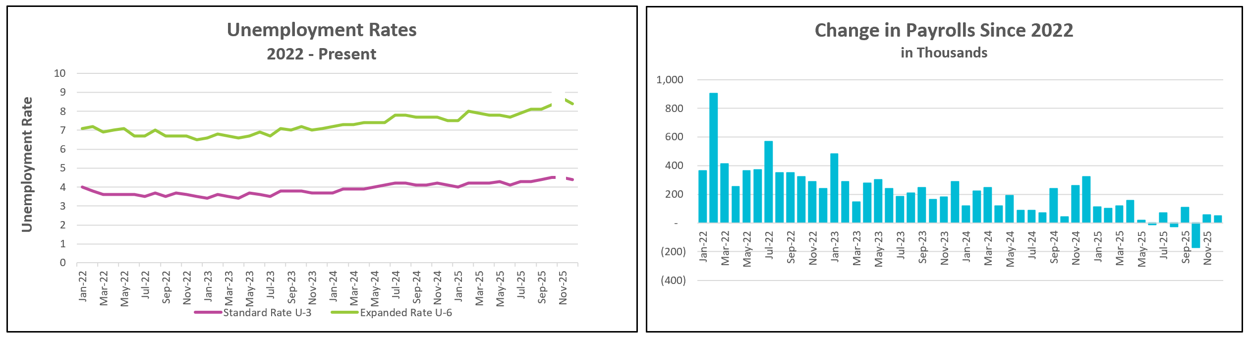 Federal government employment also increased modestly, rising by 2,000 in December; however, federal payrolls have decreased by 277,000 since December 2024, following the initiation of broad government cutbacks. The graph below compares increases in the sectors we follow the most closely in 2024 and 2025.